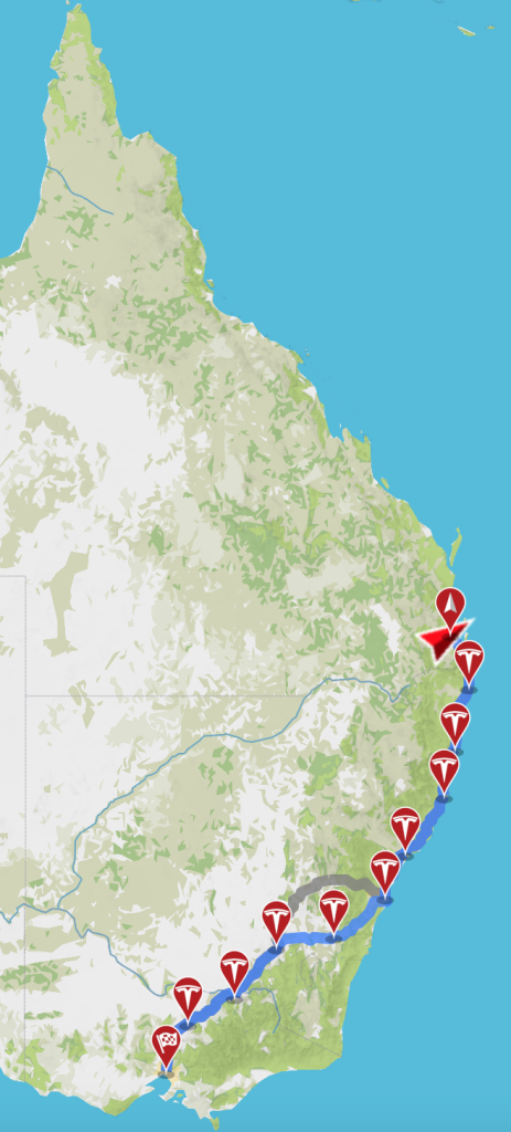 For more than half the time over the entire journey, we used 50kW Tritium (brisbane built) chargers provided by the Qld state government (QESH) and the NRMA.  These take around 40-50 minutes to charge up, adding 200km+, and be ready for the next leg of the journey.  For most of the Brisbane to Melbourne and back leg we used the Tesla superchargers (100kW) which were twice as fast meaning our stops to charge were under half an hour.