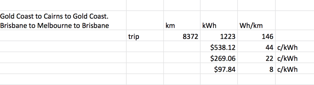 8372km is around half the total distance that most people drive in a whole year.  Charging more slowly at normal residential electricity prices (22c/kWh), and traveling that same distance, would cost $269.06.  Charging from a home Solar PV system, versus selling that surplus electricity to the grid would cost $97.84, depending of course on your Solar PV feed in tariff.  Imagine spending $200-$600 for fuel for an entire year!