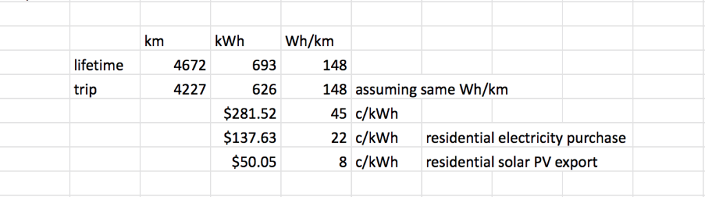 We used around 626kWh of energy to travel that distance.  If payment was enabled on the state government chargers it would have cost us $281.52.  As it turns out, at least this time around, charging was free.  Charging more slowly at normal residential electricity prices, and traveling that same distance, would cost $137.63.  Charging from a home Solar PV system, versus selling that surplus electricity to the grid would cost $50.05, depending of course on your Solar PV feed in tariff.
