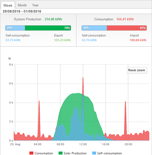 In the graph below the solar generation “bell curve” on a sunny day can be clearly seen. As you can see in the graph, blue is the usage which has been offset with solar, and green is surplus electricity exported to the grid. The red area is electricity imported from the grid at non solar generating times and when there is not enough solar generation.